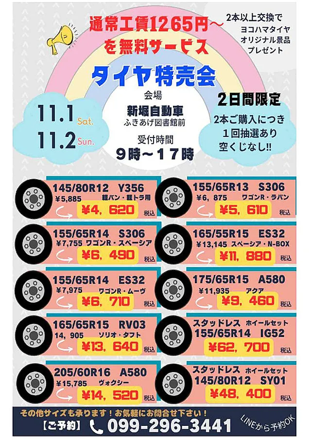 11月1日(土)・2日(日)の2日間限定で、新堀自動車(ふきあげ図書館前)にて「タイヤ特売会」を開催いたします!