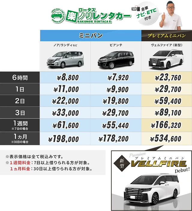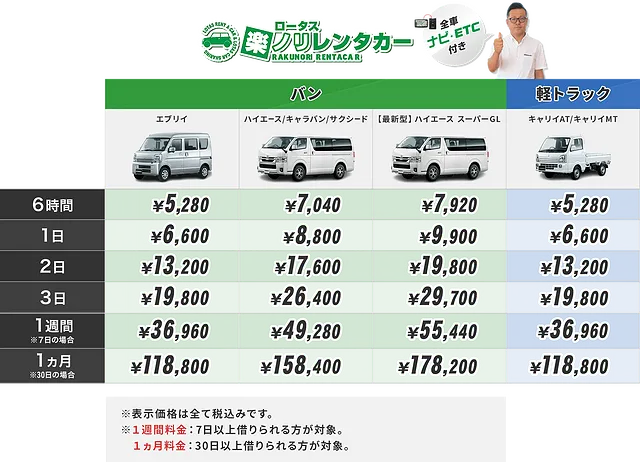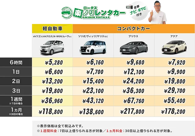レンタカーは軽自動車から7人乗りのお車まで、格安料金でご利用いただけます。