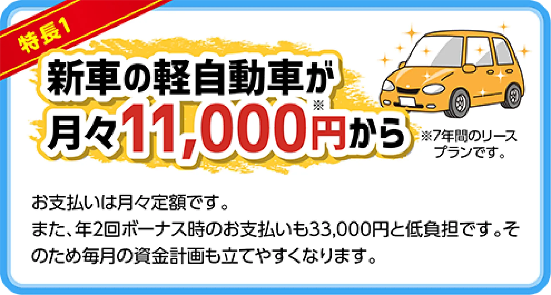 フラット7の最大の魅力は、月々1.1万円から新車に乗れる手軽さです。